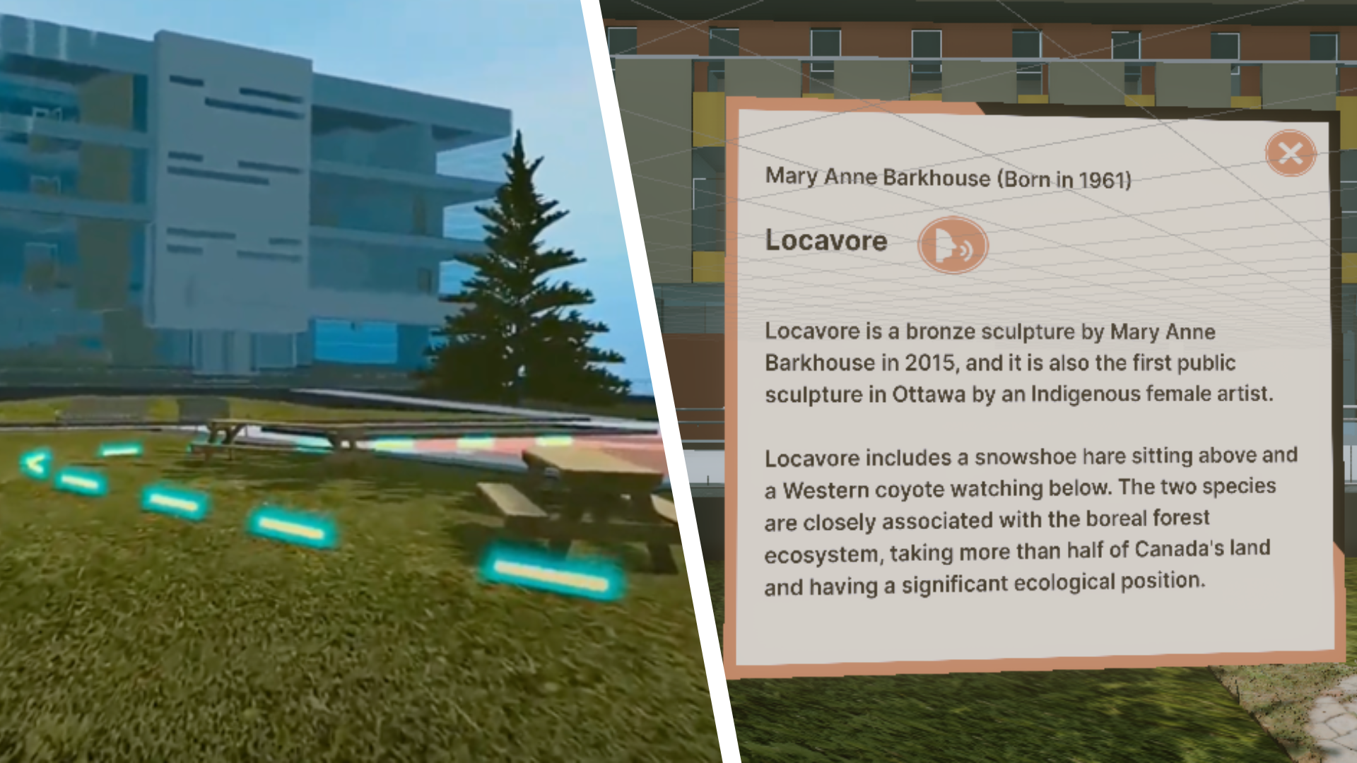 Within the VR experience, users follow light markers on the ground to lead the participant through the multi-location tour. At each artwork, an information panel is present that includes both text and audio narration explaining the significance of the artwork.